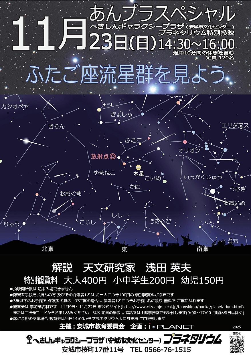 秋から冬は流れ星(流星)を見るチャンス!特に12月13日から14日にかけてピークを 迎えるふたご座流星群は、最もたくさん流れる流星群として有名です。そこで流星群