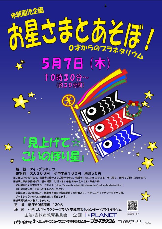 5月5日はこどもの日。町には鯉のぼりが泳いでるね。夜空の鯉のぼり星を探してみよう!鯉のぼりの手遊びのあとには星空癒しタイム。リクエスト曲を聴きながら満天の星をゆったりと楽しみましょう。