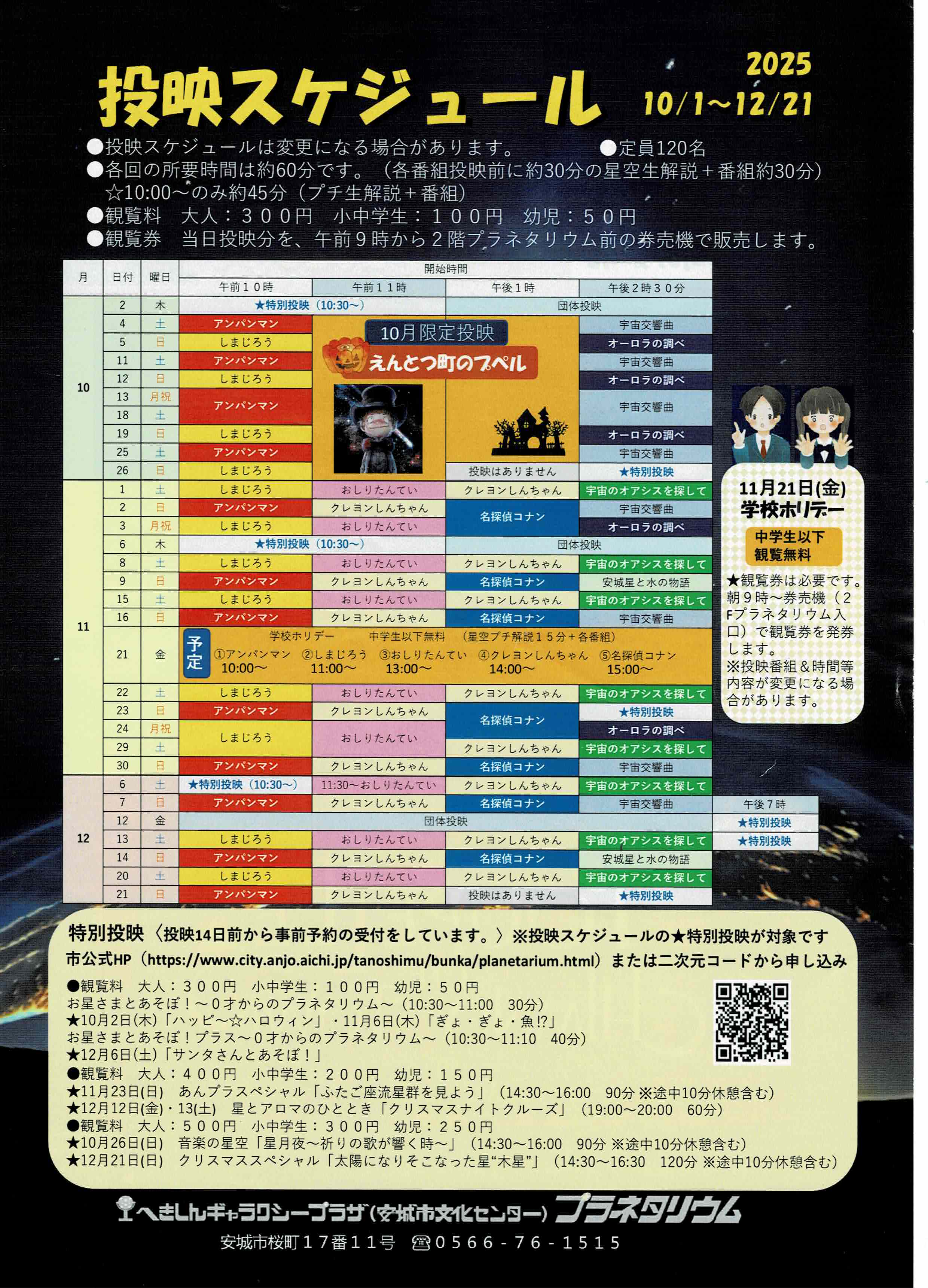 ★プラネタリウム投映スケジュール★ ※投映スケジュールは変更になる場合があります。 |