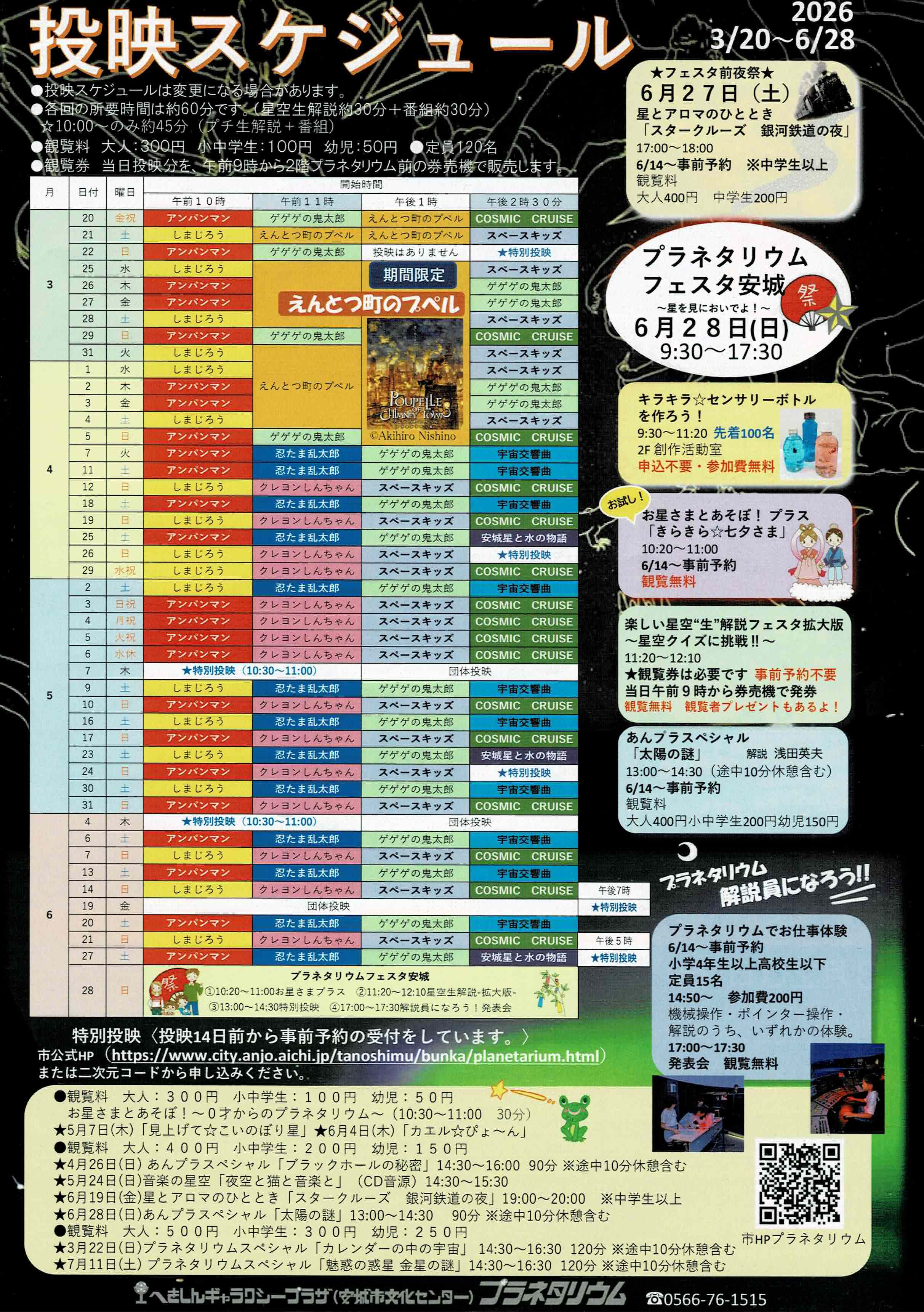| ご注意 | ・日曜日が祝日の場合は日曜の投映スケジュールになります。 | |||