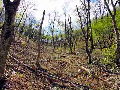 東峰下の稜線分岐で最後の眺望を楽しみ、そのあと休憩なしで登山口まで下ってきました。