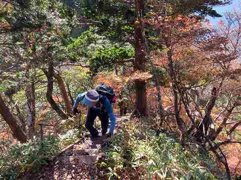 鉄階段を上る 日本岳のコルからは鉄階段・鉄梯子上りの始まりです。 |