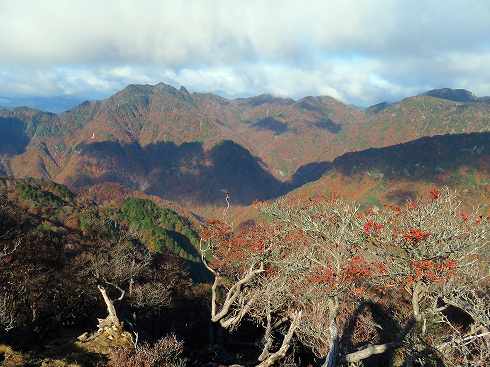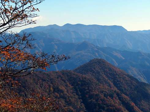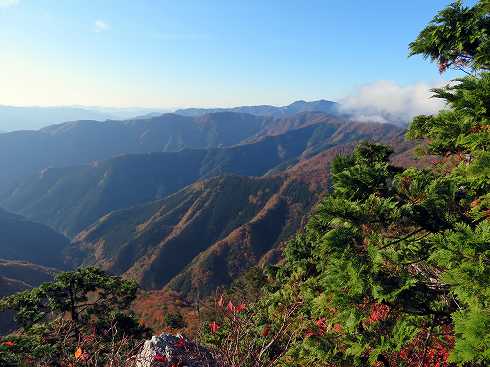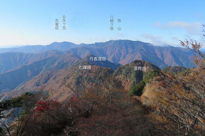 大普賢岳を望む 西側が開けていて大普賢岳がどーんとその姿を見せていました。 登って行った尾根や歩いてきた国見岳への稜線も見えますね。 この和佐又山で本日最後6座目を登頂できたので下山することにします。 〔和佐又山山頂 発=15:20〕 |