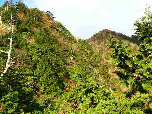 国見岳が見えてくる 水太覗から少し行くと前方に国見岳が見えてきました。 後方の山は八経ヶ岳です。 国見岳へ行く前に右手前のピーク・弥勒岳へ登っていきましょう。 |