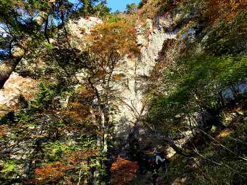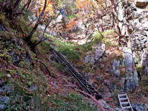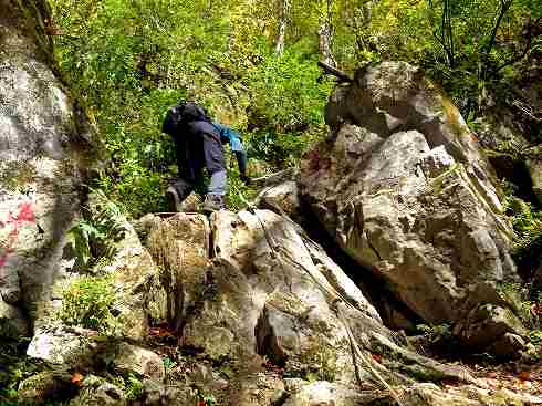 岩の急登 水簾の滝から尾根をトラバースするように進み、次の涸れ沢をわたってからが大変でした。岩の赤矢印や 赤テープ、ふみ跡を探しながら次の尾根の斜面を登ります。 底無井戸を探していると後から来た人が教えてくれました。写真の岩をさらに登っていったところだというのです。 矢印は《上》なので登ります。ロープがあり大きなホッチキスの足場もありました。 |