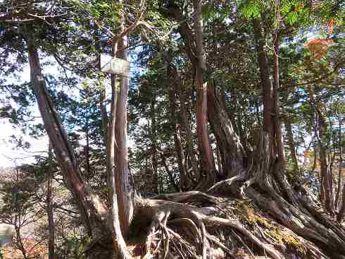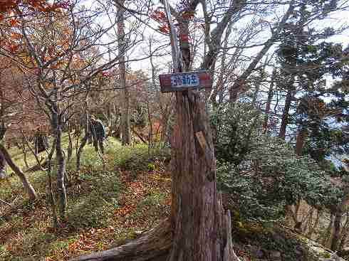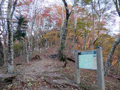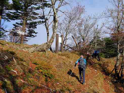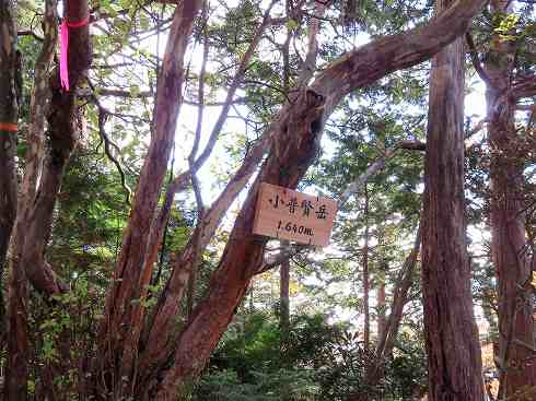 小普賢岳山頂(1,640m) 小普賢岳の山腹を巻くように登っていくと山頂への登り口案内標識がありました。 この山頂はパスする人もいるようですが標高差で約50m、登っちゃえーということで本日の1座目をゲット。 ただし展望はありません。 〔小普賢岳=8:15~8:20〕 |