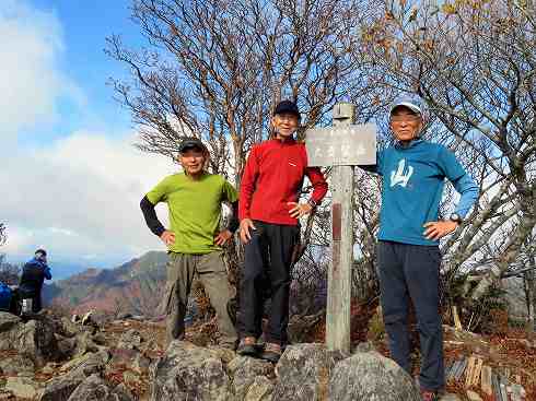 七曜岳(1,584m) そして七曜岳山頂。ここからも大普賢3兄弟が望めます。 狭い岩場の山頂ですが、ここで昼食をとり下山します。 といってもこのあとも楽ではありませんでしたが。 〔七曜岳=11:05~11:35〕 |