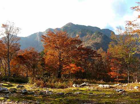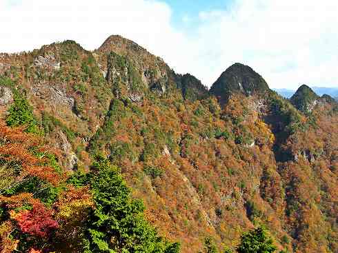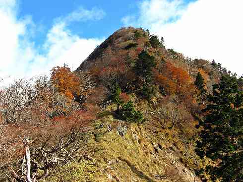 大普賢岳を振り返る 山頂から少し下って振り返ると紅葉をまとった大普賢岳。みごとな立ち姿です。 |
