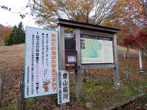 登山口 10分ほど行ったところに登山ポストがありました。 そのまま林道を歩いても行けますが、ここからショートカットして左へ入っていきます。 なお、登山届はネットで提出済です。 〔登山口=6:15〕 |