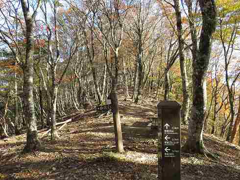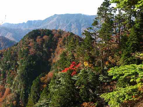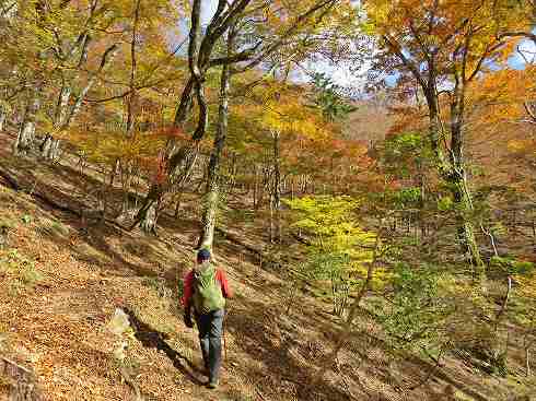 紅葉のトラバース道 きつかったのは底無井戸までで、そのあとは歩きやすい山腹の道でした。 秋の日差したっぷりの紅葉の道を行きます。ただし距離がありましたねえ。 |