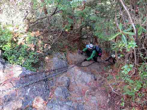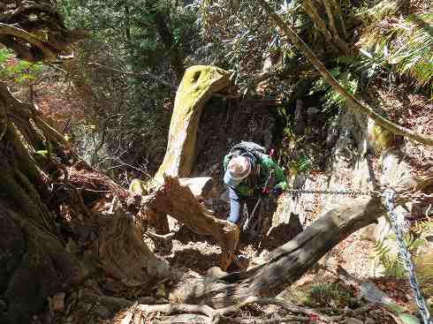内侍落し 国見岳あたりまでは雰囲気のいい大峯奥駈道歩きだなあと思っていました。 ところがこの先、ロープ場・鎖場などがたくさん出現。写真は『内侍落し』というところだそうです。 〔内侍落し=10:30〕 |