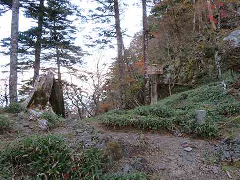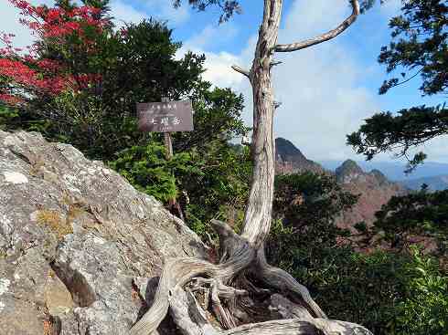 日本岳のコル 鷲の窟を過ぎて岩場を登り鎖を伝って日本岳のコルまできました。 日本岳はコルの右手にありますがこれはパス。ここから左へ大峯奥駈道となり、小普賢・大普賢岳方面へ 登っていきます。 〔日本岳のコル=7:40〕 |
