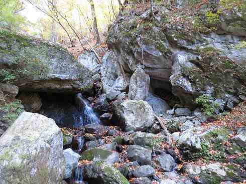 無双洞 七曜岳を後にするとすぐの分岐を左直角に和佐又の方へ下ります。 詳細は省きますが梯子があったりの急降下の道でした。 尾根の途中から左の斜面を下り 沢に降り立ったところが無双洞でした。無双洞は奥の深い洞窟できれいな水が絶えず流れ出ているところです。 〔無双洞=12:45~12:50〕 |