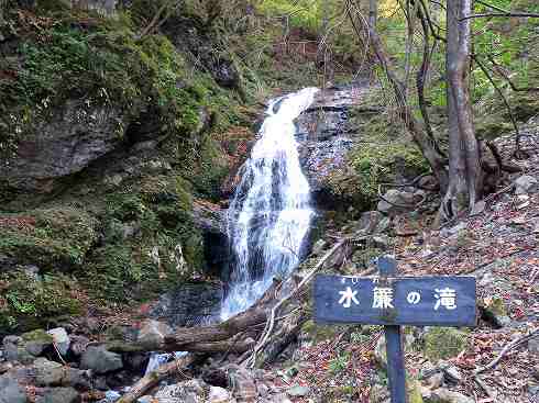 水簾の滝(すいれんのたき) 無双洞を出ると《水簾の滝》への案内板があったので立ち寄りました。 沢の水が滑滝となって流れ下った先が水簾の滝です。 〔水簾の滝=12:55〕 |