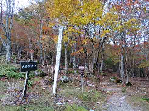 山頂への分岐 鉄階段を上り、急登の道を登って右手からくる山上ヶ岳からの道と出会います。 ここまでくれば大普賢の山頂は左へすぐでしょう。 |