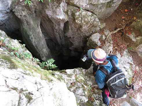 底無井戸 先ほどの人が『ここまでくると皆さんばてるんですよ』と聞いた岩壁を登ってくるとありました底無井戸。 小石を放り込んで音を聞くと少し深めの井戸のようです。水はないのかな。 〔底無井戸=13:50~13:55〕 |