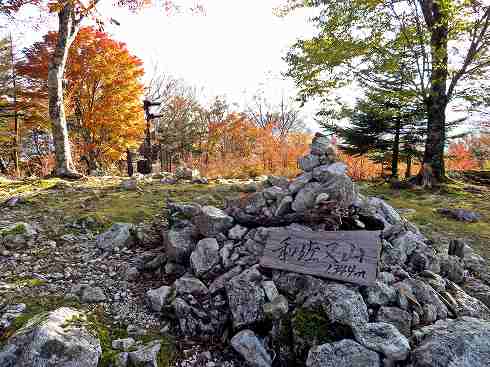 和佐又山山頂(1,344m) 標高差で100m、疲れた足を引きずって和佐又山山頂まで登ってきました。 中央にケルンが積まれた広く明るい山頂です。 〔和佐又山山頂山頂 着=15:05〕 |
