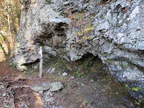 シタンの窟(いわや) 登っていくと左手に大普賢岳から七曜岳への稜線が見え隠れします。 そして最初の窟・シタン(指弾)の窟まできました。 〔シタンの窟=7:10〕 |