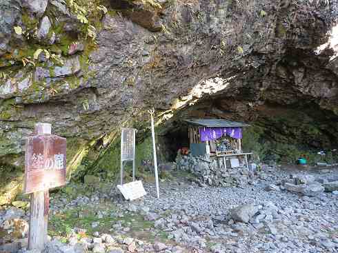 笙の窟(しょうのいわや) 白い大岩壁の下に3つ目の笙の窟がありました。 これが最も大きい窟でしょうか、修験の場だったようで祠が祀られています。 〔笙の窟=7:25~7:30〕 |