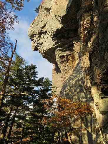 オーバーハングの岩 一休みして笙の窟を出発するとすぐ、前方にオーバーハングした巨岩がそびえて見えます。この下に 鷲の窟がありました。鷲の窟はやや小ぶりの窟でした。 〔鷲の窟=7:32〕 |