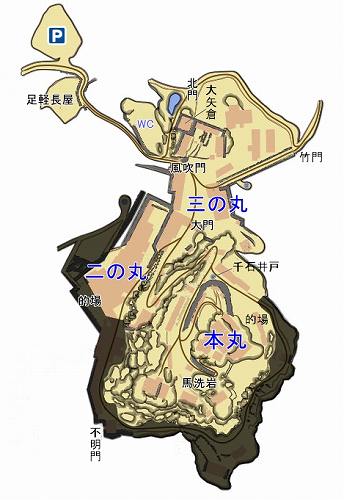 苗木城跡のイラストマップ 中津川市にある国の史跡苗木城跡は、木曽川右岸そびえる城山(432m)にあります。急峻な岩山の自然の地形を生かして造られた山城で 巨岩をそのまま利用して築かれているそうです。 苗木城跡駐車場から本丸まで行ってきます。 〔苗木城跡駐車場 発=16:10〕 |