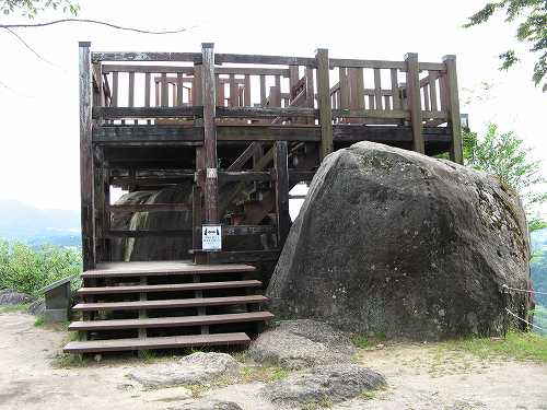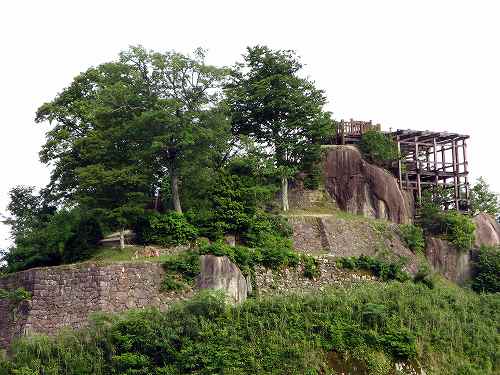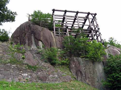 本丸を見上げる 本丸直下まで登ってきました。展望台として櫓が巨岩の上に組まれています。もちろん直登はできず 左から回り込んで登ります。 |