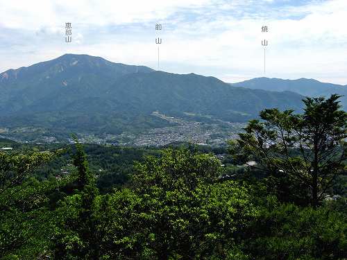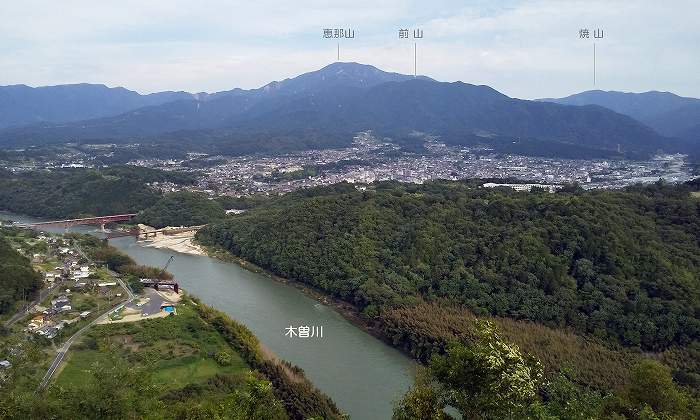 展望台から南東側の眺望 展望台に上がるとなかなかいい景色が広がります。 まずは南東側で、正面に恵那山、その右手前に前山、右奥に焼山、そして中津川の市街地と木曽川の流れを見下ろします。 |