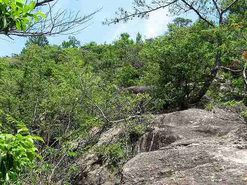 岩場を登る その後も岩場を登ります。ここはまだいいですが、大きな岩の城壁のようなところもあって、左へ巻くようにして登りました。 ただ巻いたところもヤブ漕ぎを強いられます。 |