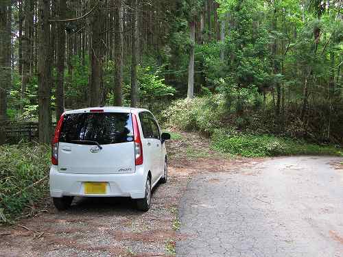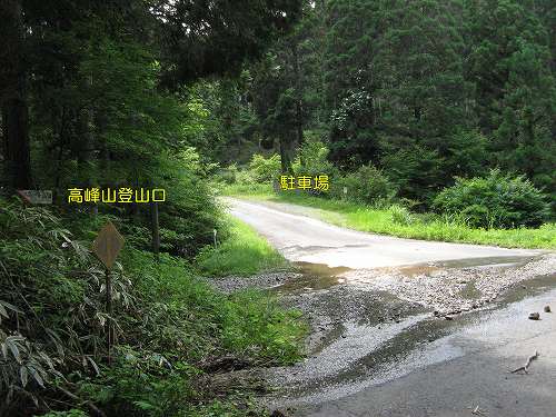 高峰山登山口 ちんの峠から少し下った林道の交差するところが高峰山登山口。ここにも3台ほど車が置ける駐車場がありました。 |