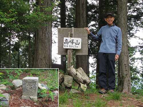 高峰山登頂記念(945m) 山頂も展望がないので、せめて登頂記念・証拠として写真を1枚撮っておきます。二等三角点がありました。 |