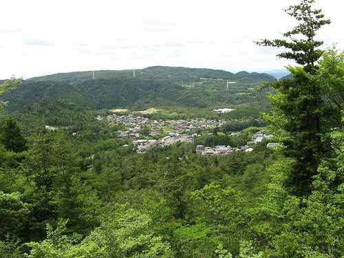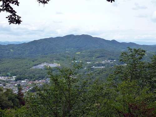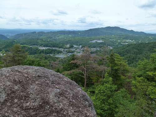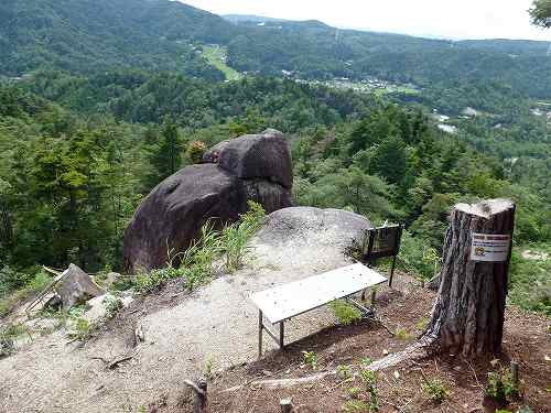 天狗岩からの景色 天狗岩から見た景色です。右の山は先ほども見た屏風山。 その左奥遠くの山は雲があって判別できないけど、よく晴れていれば白山や能郷白山なども見えるそうです。 〔天狗岩 発=14:15〕 |