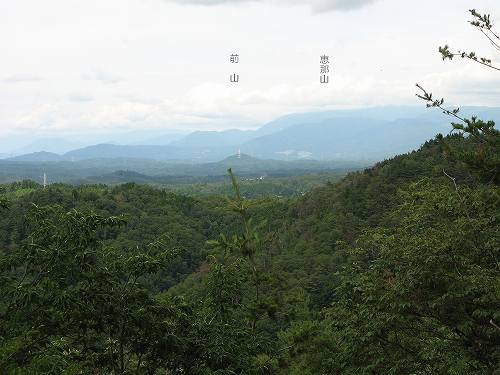 恵那山方面 屏風山の右奥には中央アルプスの山が見えるはずですが雲がかかっていて今日はだめ。 右端の方に頭に雲がかかった恵那山などが見えるのみでした。 |