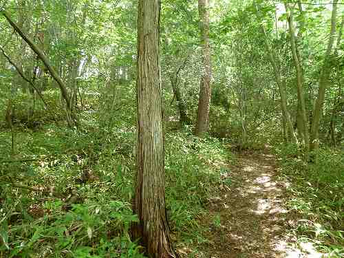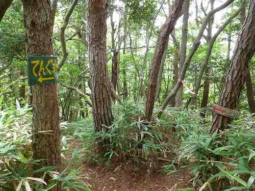 天狗岩分岐 森の中の歩きやすい道をしばらく行きます。 そして天狗岩への分岐に出ました。天狗岩も帰りに寄ることにしてまずは義呂利松三角点へ行きましょう。 〔天狗岩分岐=13:35〕 |