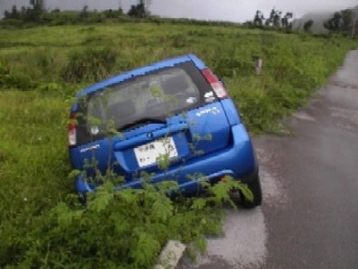 なーんと自ら道の外へはずれてしまい、車が思いっきり傾いて身動きが取れなくなっちゃったー!