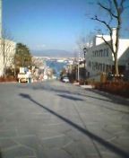 写真だと分かり辛いですが、石畳の坂道で、奥に海が見えてます。