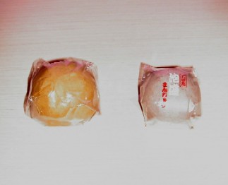 14.ふらっと入った創作和菓子屋で買った「黒糖まんじゅう(左)」と「泡盛まんじゅう(右)」。