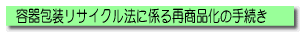 容器包装リサイクル法の施行に伴い一定の条件に該当する事業者はリサイクル(再商品化)の義務を負います。(特定事業者という)この特定事業者は(財)日本容器包装リサイクル協会に再商品化を委託することにより義務を果たすことができます。 |