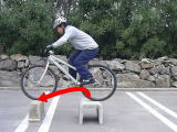 前編の「丸太越え」では前輪を障害物の上に置き、ホップしながら地面に向けました。 この項ではホップした先に別の障害物がある場合の「橋渡し」です。挿絵では練習用に都合よくホイールベース程の距離にU字溝と縁石を置きました。 実戦ではこんなにも都合の良いセクションなんてナカナカ見当たりませんが、とりあえず基本をマスターってことで… いろんな高さや距離を試してみてください。 |