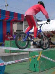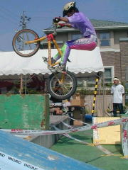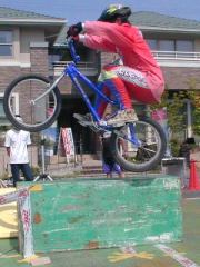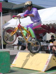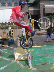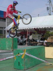 ![]() 飛里充志(あつし)くんさすがに慣れています。 やりたい放題といったところでしょうか? MC(澁谷さん)が「お〜Yes!」とか意味不明な言葉を発していました。 <右の画像は上の画像の直樹君が飛びついた台からの飛び降りです。 この位は余裕ですね。 ハンドルをキュッ!とひねって欲しかったです。 >左はステージからの飛び移りです。 飛び降りた先が高さも距離もあったことが潰れたリアタイアで解りますね。 |