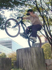 ![]() ステージからの飛び降りです。 6段もあるのに余裕シャクシャクでした。 上のジャックナイフターンの画像を見るとフロントのスポークがやけに少ないですね。 エアロスポークで平たいのが付いていました。 |