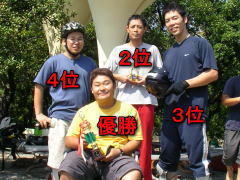中級 初参戦&初優勝のよじさんは誰もやらない難しいライディングでオールクリーンを叩き出し、文句なしの優勝。 致命的な5点を食らったいきさんはその後、安定したライディングで2位を死守。 いしださんは第1セクションでパンク&5点を食らい、最終セクションでも惜しくも5点を食らって3位。 終始、凄いライディングと面白いライディングを繰り返し、ギャラリーを楽しませたカワイさんは4位。 5位のかまたさんは2点と3点が無く「一か八か」のような感じ? パンクのトラブルで4度もチューブを交換する羽目になり、戦意喪失したハットリさんも後半に持ち返しました。 今回から中級に昇格したアキラZさん、最下位の洗礼を受けました。 ちなみに私(いそし)は入念な下見でオールクリーン… スイマセン… 初級 優勝をもぎ取ったのはよじさんのお兄さん(りゅうのすけさん)。 兄弟で優勝をGET!! 優勝候補のぢいさんは難しいラインを選び、2位に甘んじました。 前回はけんたろうさんに負けたたかひろさんはリベンジで3位。 主催者の思惑通りに足を着きまくって最下位をGETしたのはけんたろうさん。 楽しいコンペをありがとうございました。 |
