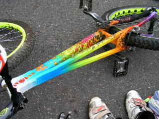 | 寺井一希選手のMONTY221Ti ’07モデル。 | 一際目を惹いた二股トップチューブのフレーム。 |