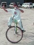 コンペでも役にたたないし見栄えもしない地味なテクニックですが、バランス感覚を磨くには良い練習と言えるのが「手放しスタンディング」です。 見る方は「お〜っ!」という感じではなく「お?」という感じで小さく驚いてくれます。 中には「で?」と聞いてくる方もみえますが、そんな時には両手放しでビールでも飲んで見せて差し上げましょう。 少しは感心してくださる事でしょう…手放しスタンディングには3種類あり、両足をペダルに乗せたまま立ち上がるものと、シートに座りながら片足をペダルにもう片足をタイヤに乗せるもの、両足をタイヤに乗せるものと分類されるでしょう。 今回は最後の両足編です。 |