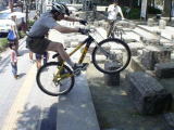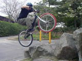 フロントタイヤを段差の上に乗せて「エイヤっ!」っと飛び乗り、上でダニエルの状態になるテクニックの「突き出し」にはどうやら種類があるようです。大きく分けるとクランクを全く漕がずに反発(しなり)とパワーだけで飛ぶものと、クランクを漕ぎ積極的に推進力として使うものとの分類ができるそうです。 私(いそし)はどちらかというと得意ではありません。 が… とりあえず「こんな感じですよ」ってことで公開させていただきます。 |