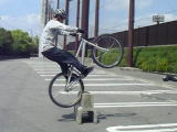 2つ目は身体が遅れてる例です。なんとか台の上にリアタイヤを乗せたのはいいのですが、身体が後方に残ってしまっているので捲くれてしまい、ウィナンドの状態になれずに後ろに落ちてしまいます。 この場合は、飛び出す位置が遠すぎる、気持ちが行ってない(恐がってる)、持ち上げることに気を取られすぎてる、のどれかが原因だと思います。 何度も練習して丁度良い場所(バランス)を探してください。 |