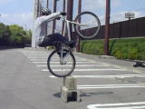 ついに、このコーナーの目標(50〜60cmのウィナンド)です。下のU字溝が30cm、上の縁石が25cmで55cmです。 この高さにウィナンドできるようになればウィリージャンプ中級合格ってところでしょうか? これ以上の高さに登るにはもう指南はいりませんね。 進入速度を上げるとか、距離を変えるとか、力でねじ伏せるとか、いろいろ試してみてください。 ちなみにこの2段重ねの練習台は固定してません。 勢い良くぶつかると… (恐 |