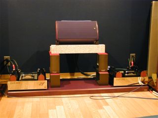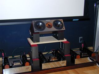 メインチャンネルパワーアンプ用ボードとセンタースピーカー用ベース導入! 最初はクワドラスパイアなどの組み合わせられるラックがおしゃれで見た目もいいので使えないか検討していたのですが、サイズが合わないことと、うちの重量級パワーアンプでは棚板が反ってしまうといわれて断念。 ラック系ではうまく組み合わせられそうもないのでボード+スピーカーベースを使うことを画策。そこでカスタムオーダーもできるTAOCのボードに目をつけたのです。TAOCのSCB(サウンドクリエイトボード)はスピーカーにも使っており、コストと性能のバランスがいいことで気に入っておりました。 名古屋のオーディオフェスタでTAOCブースで色々相談の上、ボートはSCBのCSシリーズのカスタムに決定。パワーアンプEAR534を3台並べて、スピーカーベースも置けるサイズということで、CS50を3枚並べた幅1500mmの特注品をオーダーしました。ついでにセンタースピーカーは現在、パワーアンプの下に使っているTAOCのスピーカーベースを流用し高さをさらに稼ぐため、追加で300DHをオーダーしました。 セッテイングした状況は下記、写真を参照してください。さすがにCS3枚分は重かった。真中のスピーカー下のスペースにセンター用のEAR534が納まる予定(今年中に導入できたらいいなぁ)。音に関するレポートはしばらく聴きこんでから書きます。