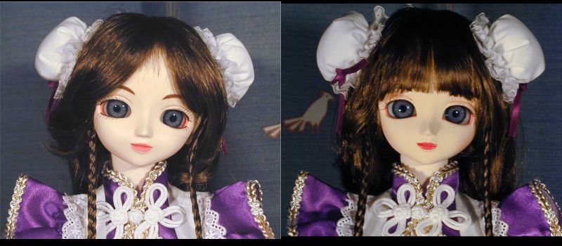鈴華のメイクのリメイク(^^ゞ完了しましたぁ。 グラスアイはまだ入手できてないし、うまくイメージに合うかまだよくわからないので、まずはデフォルトの瞳でのお披露目です。もとのりおの時との比較してみますと目が大きくなりました。後垂れ目度アップなのですが目頭をはっきりさせたので、結構しっかりした印象になりましたね。なんとなくいたずら猫っぽい感じを受けてます。後は顔色がちょっと濃いです(^^ゞ。やはり自分で調合した色では、ウレタンそのものに着色した状態のようにはなかなかならないですね。まぁ気にいってるの良しです。さて、早く注文してるグラスアイきてくれぇ。