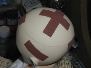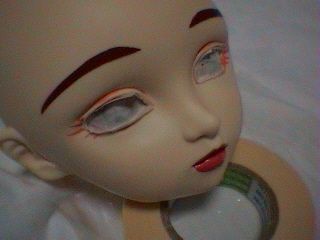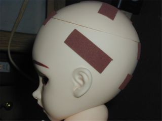 次にコーティングをしますが、これはウレタンの肌の汚れ防止と黄変色の抑制にやります。 写真は目にコーティングがつかないようにマスキングをしたところです。