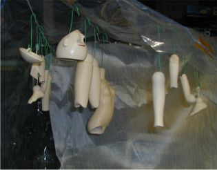コーティング前の準備として各パーツをビニールコートした針金でつるし、乾かしているところです。(写真は横向きであしからず^^;)